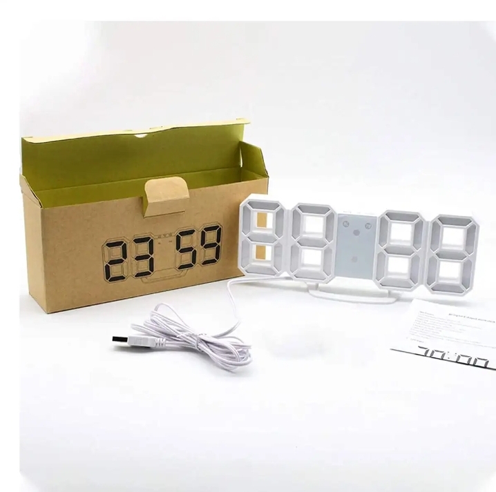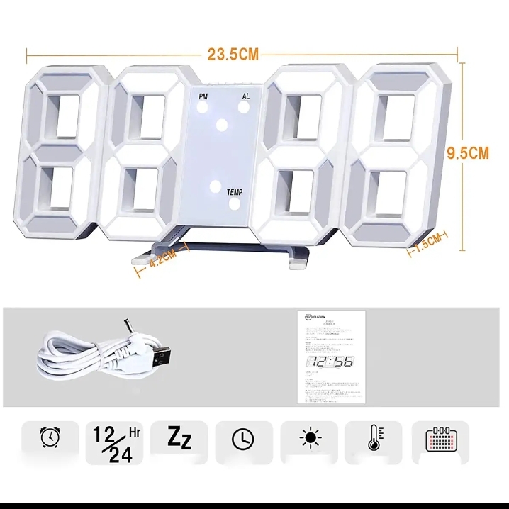 ساعت دیجیتال LED رومیزی مدرن و خاص، دارای زنگ هشدار، نمایش اعداد بصورت سه بعدی و بزرگ، تنظیم روشنایی،نمایشگر دما، USB و قابل نصب هم بصورت دیواری و هم رومیزی (دسکتاپ)؛ این ساعت با روشنایی قابل تنظیم - با روشنایی بالا در 3 سطح شدت طراحی شده است تا به خوبی در هر محیط مدرن و امروزی قرار بگیرد. ساخته شده از پوشش اکریلیک با کیفیت و درجه یک ، همراه با پایه جهت استفاده رومیزی و جایگاهی جهت نصب بصورت دیواری است. اندازه اعداد به گونه ایست که در هنگام تاریکی و در فواصل دور قابل خواندن است. دارای عملکرد ALARM & SNOOZE FUNCTION - بیدار کردن و عملکرد استند بای است. و زمان استندبای (همچنین تاریخ) را می توان آزادانه تنظیم کرد.