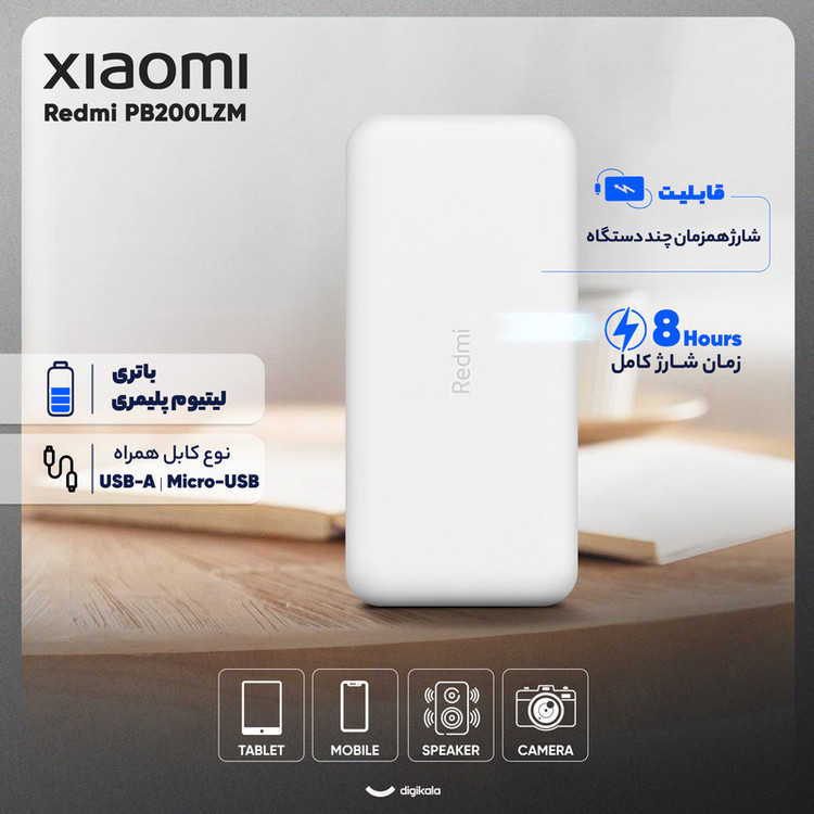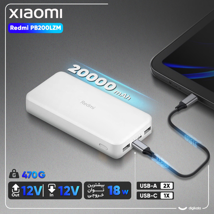 پاور بانک 20000 Redmi مدل PB200LZM ساخت شرکت شیائومی (xiaomi) است. این پاور بانک یک وسیله جانبی پرکاربرد است که نگرانی تمام شدن باتری گوشیهای هوشمند را از بین برده است. این دستگاه توانایی 4.8 مرتبه شارژ Iphone XS را دارد. Redmi 20000 با داشتن دوپورت خروجی USB و پشتیبانی از انواع پروتکلهای شارژ سریع، بهترین همراه شما در خارج از منزل، محل کار و یا هنگام سفر خواهد بود. این محصول با استفاده از سیستم شارژ هوشمند به راحتی میتواند به طور همزمان دو دیوایس شما را شارژ کند، شارژ هوشمند ورودی مناسب را برای هر دیوایس در نظر خواهد گرفت. این محصول با ابعاد 7 × 15 سانتیمتر سبک، راحت و قابلحمل است و به راحتی میتوانید انواع دیوایسهای خود مانند گوشیهای هوشمند، دوربین، تبلت و غیره را در طول روز شارژ کنید. پاور بانک همراه شیائومی دارای سیستم محافظت در برابر مشکلاتی مانند نوسانات برق، اتصال کوتاه، تغییرات دما، اضافه جریان در ورودی و خروجی و غیره است. این پاور بانک از پورت خروجی دوگانه USB_A و پورت ورودی دوگانه USB-C و MicroUSB برخوردار است. همچنین حداکثر میزان قدرت برای پورت ورودی 5V _2.1A و پورت خروجی آن 5.1V_3.6A است. این دستگاه دارای دو درگاه ورودی MicroUSB - TypeC برای شارژ است و قابلیت سازگاری با تمامی گجت های هوشمند شما را دارد. در مجموع این پاور بانک با توانایی چندین بار شارژ گوشیهای هوشمند، میتواند یک انتخاب مناسب برای استفاده روزمره باشد.